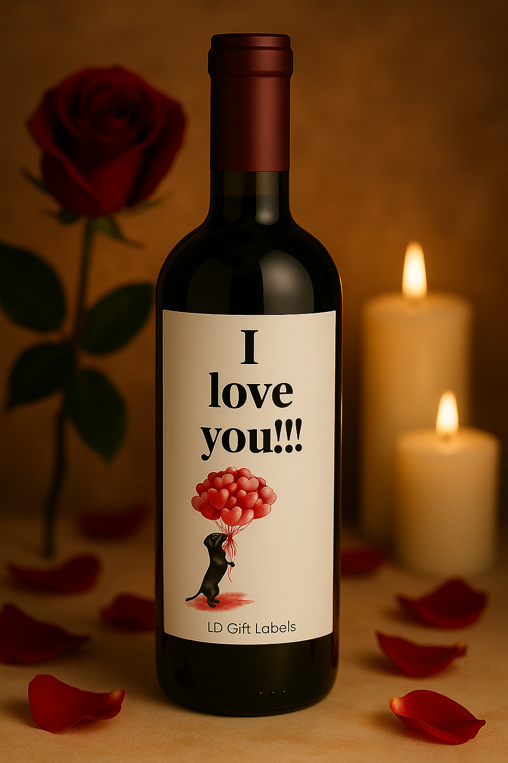 Een liefdevol cadeau verdient een label dat recht uit het hart spreekt. Dit charmante wijn- of giftlabel met een schattige illustratie van een teckel met een tros hartvormige ballonnen is dé manier om jouw gevoelens te uiten. Of het nu voor Valentijnsdag, een jubileum, of gewoon zomaar is – dit label maakt elk moment extra speciaal.